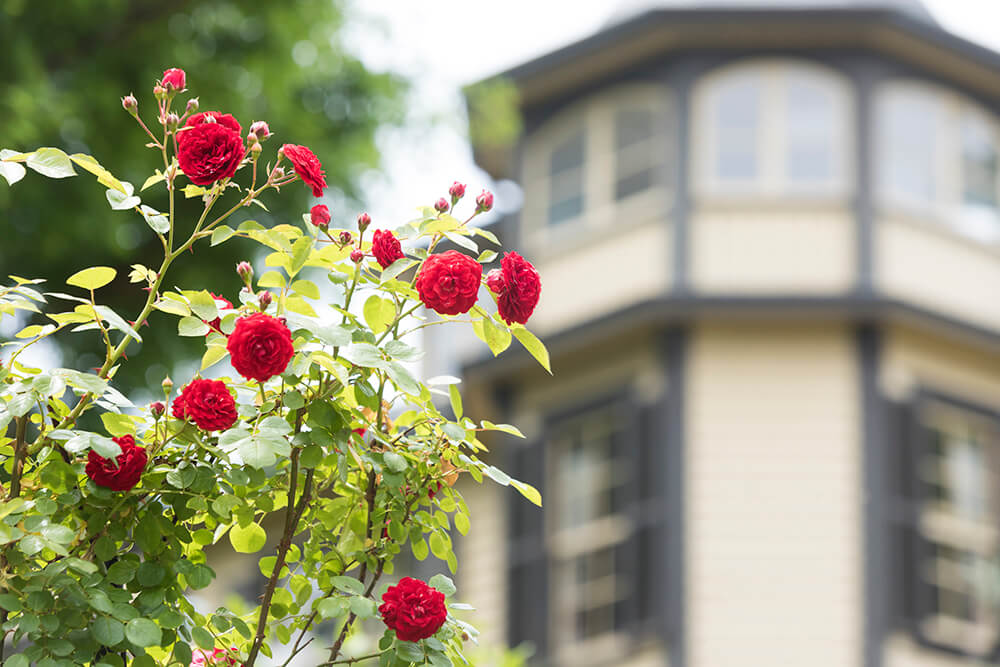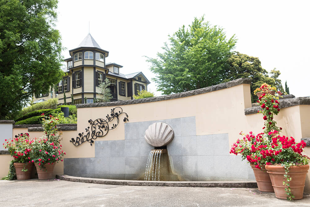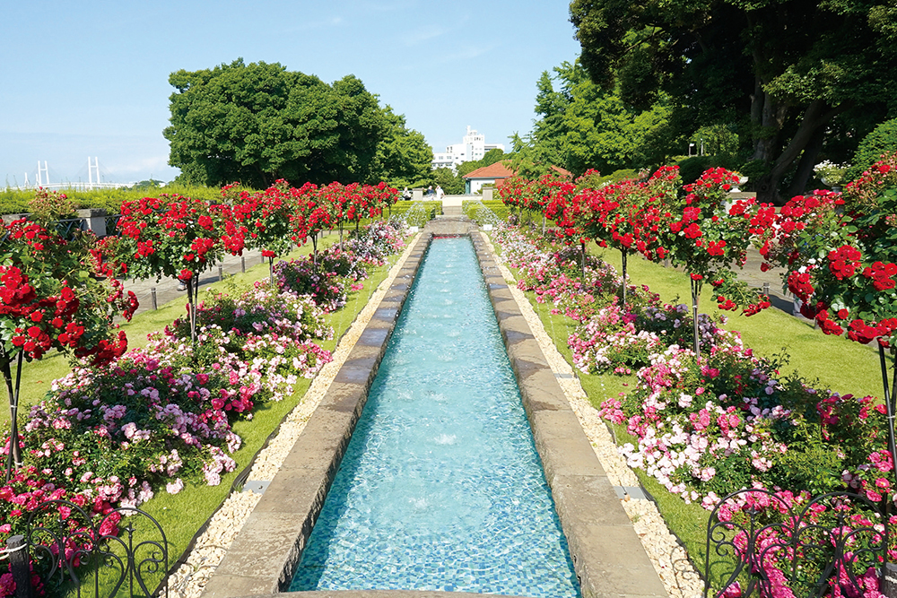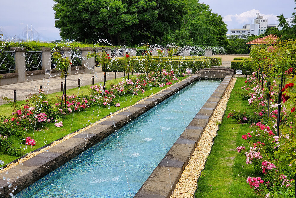 明治13(1880)年から明治19(1886)年まで、イタリア領事館が置かれたことから「イタリア山」と呼ばれています。イタリアで多く見られる庭園様式を模し、水や花壇を幾何学的に配したデザインの公園です。「バラと輝く噴水の庭」というテーマでリニューアルされ、新たなバラの名所となりました。